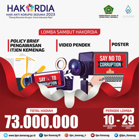 hormat, dalam rangka memperingati Hari Anti Korupsi Sedunia (HAKORDIA) 2023, Inspektorat Jenderal Kementerian Agama menyelenggarakan lomba bagi ASN Kemenag, siswa madrasah, dan mahasiswa pendidikan tinggi keagamaan yang meliputi:
